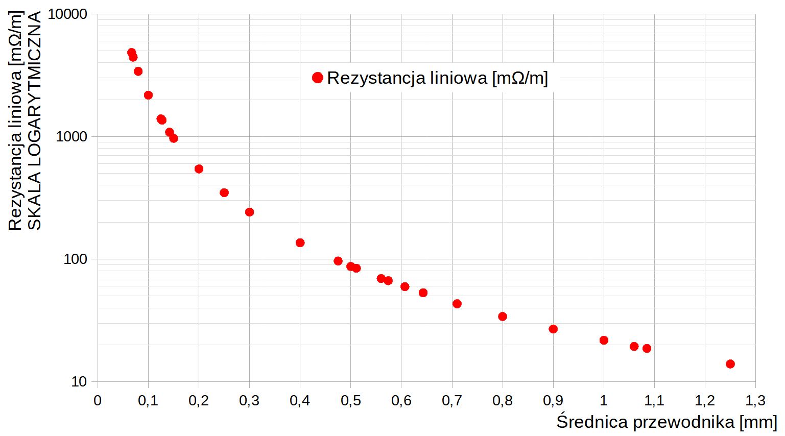 Unfortunately, both methods increase the material costs – both thicker wires and more noble materials are simply more expensive. This means that the design of the product must be optimized for the required application, already at the design stage. At this stage, we will also more often encounter the concept of linear resistance, i.e. the electrical resistance of a winding wire one meter long. Below is a graph of the relationship between linear resistance and wire diameter.