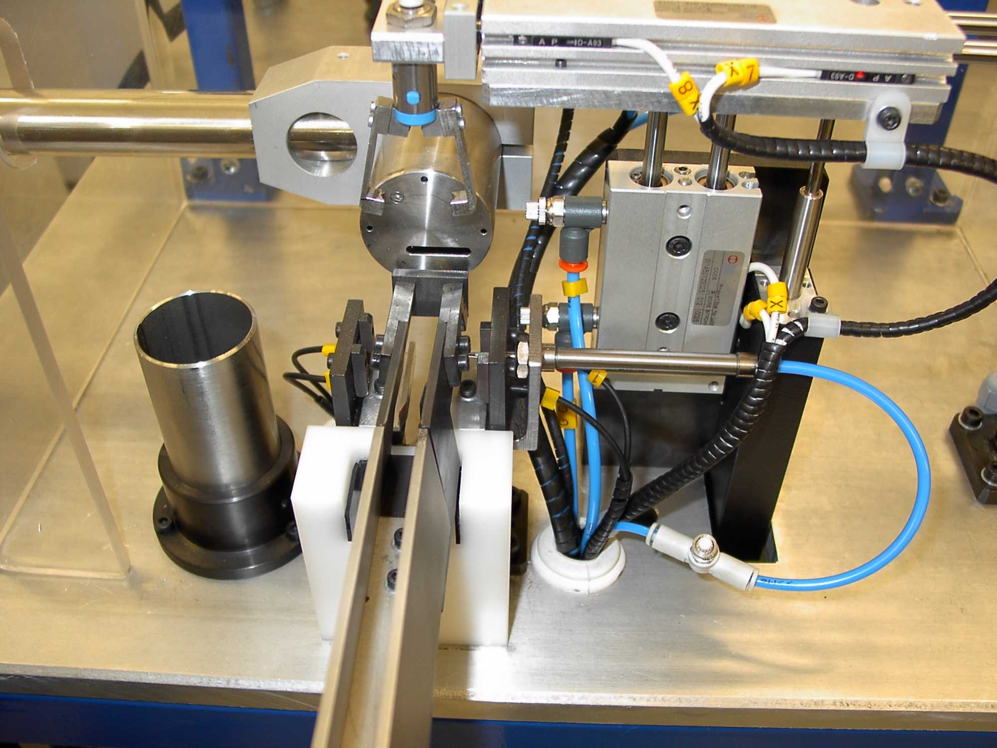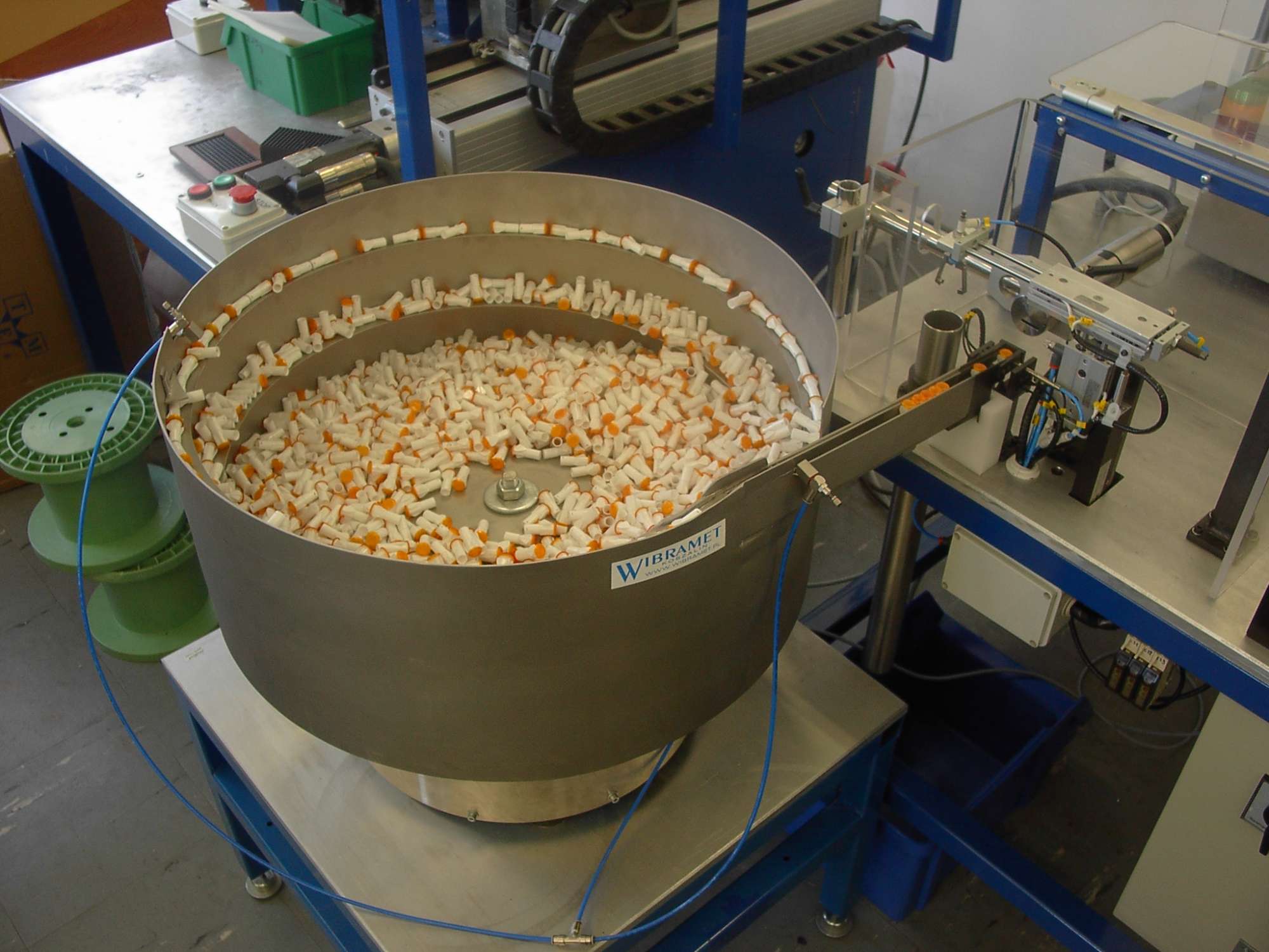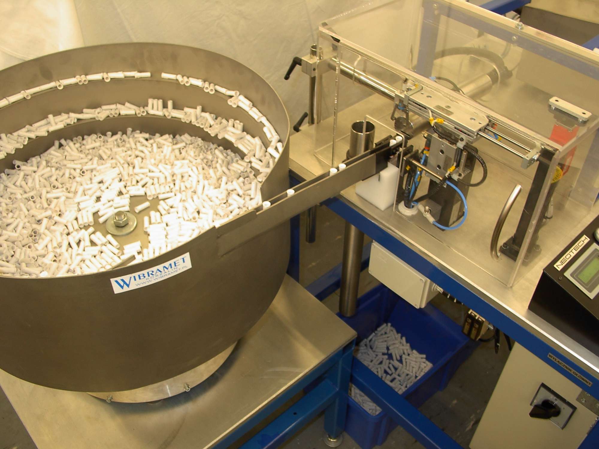 The operation of the machine comes down to filling the vibratory feeder container with holders and starting the device. The vibratory feeder together with the replaceable container and magazine constitutes the orientation and feeding system of holders to the positioning unit.