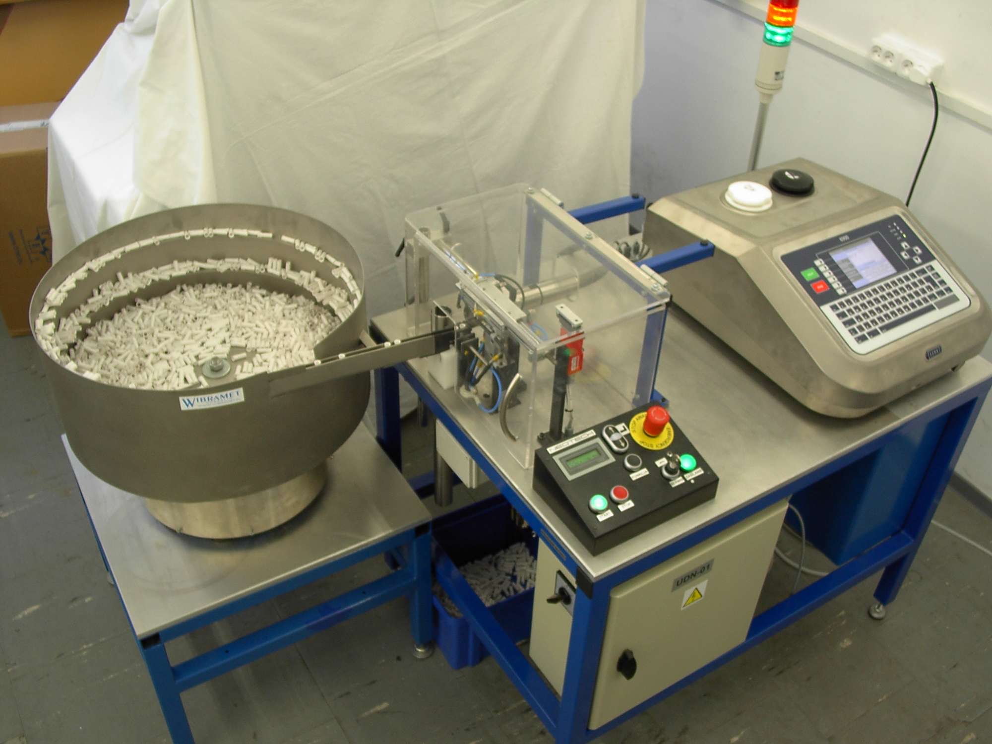 An appropriately oriented holder is grabbed by the gripper and during transfer to the dropping zone, the print is made. The UDN-01 printing device operates in an automatic cycle.