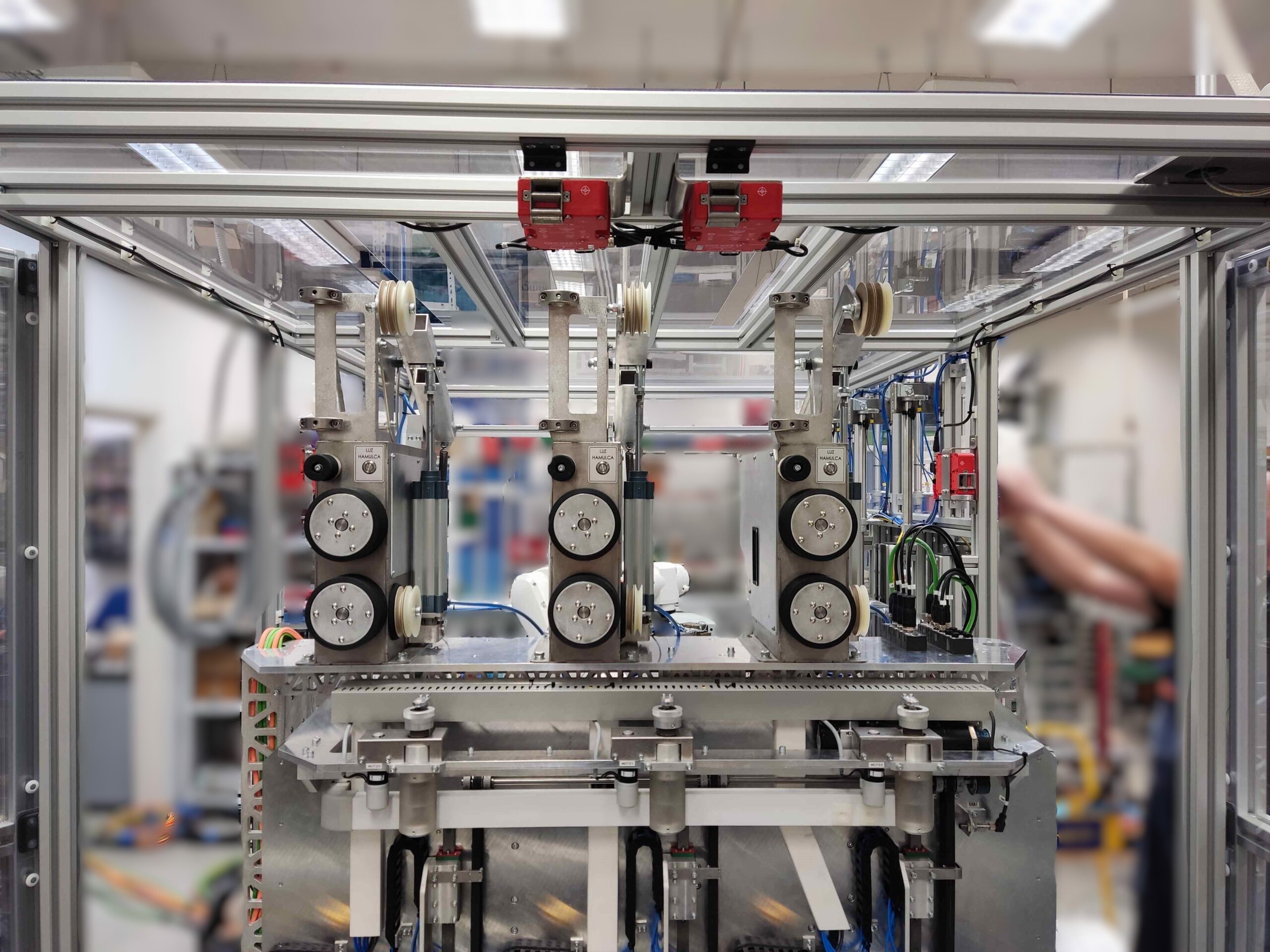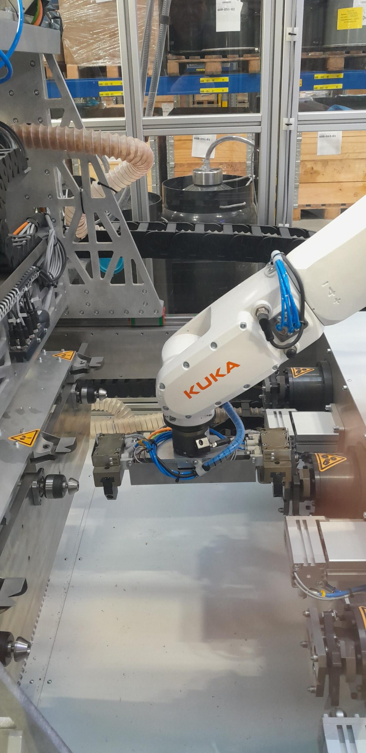 The machine is equipped with a three-axis XYZ feed manipulator guiding the wire and a 6-axis KUKA industrial robot arm that transfers motor pole packages from the exchange sockets to the winding spindles and vice versa.