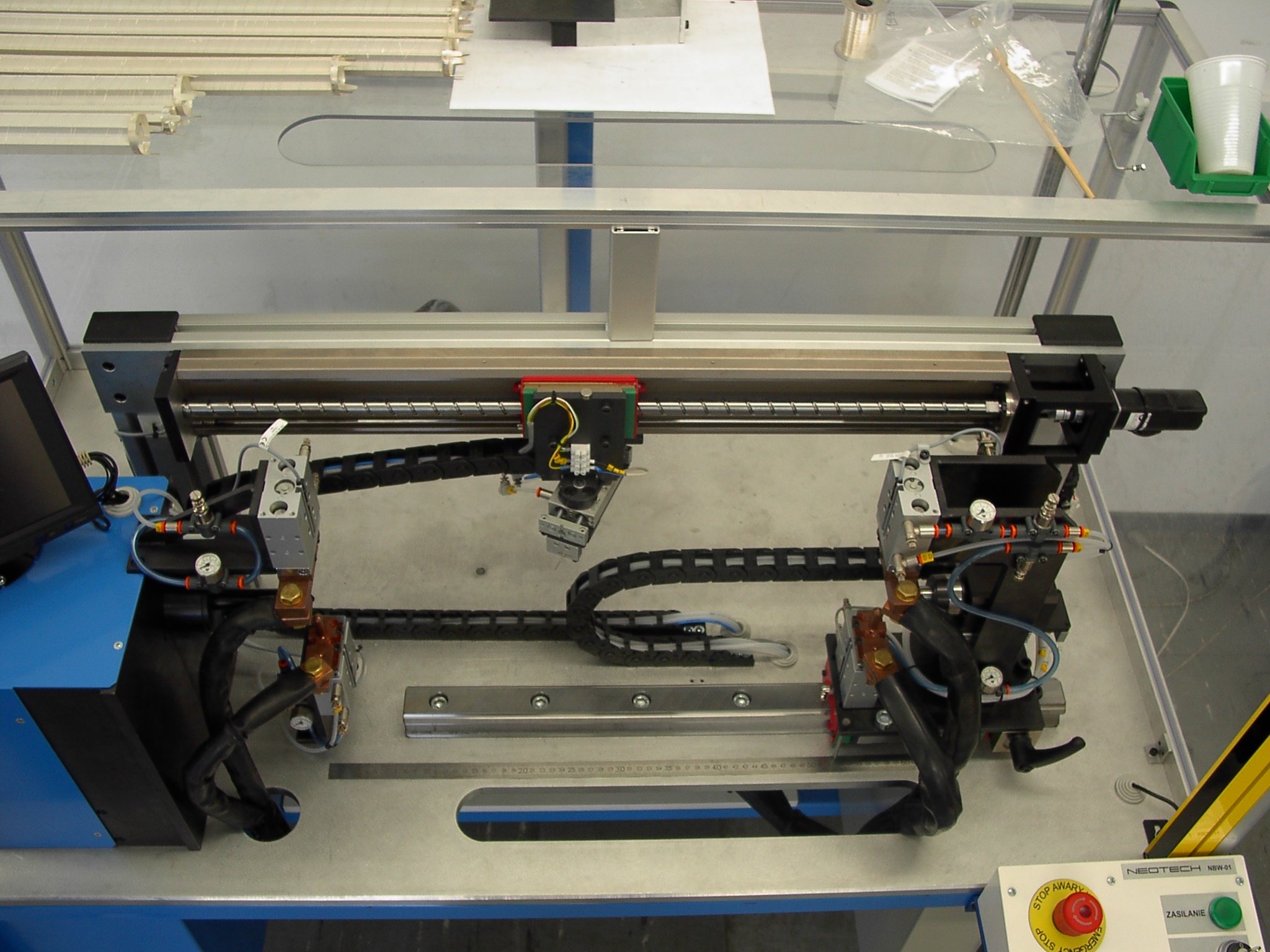 Budowa urządzenie umożliwia złożony ruch zespołu wrzeciona i manipulatora zapewniającego posuw w trakcie nawijania. Gwarantuje to nawinięcie na wspornik drutu topikowego o odpowiedniej długości zgodnej z wymaganiami technologicznymi. Po nawinięciu odbywa się drugie zgrzewanie, po którym drut jest urywany. Cykl nawijania może być powtarzany.