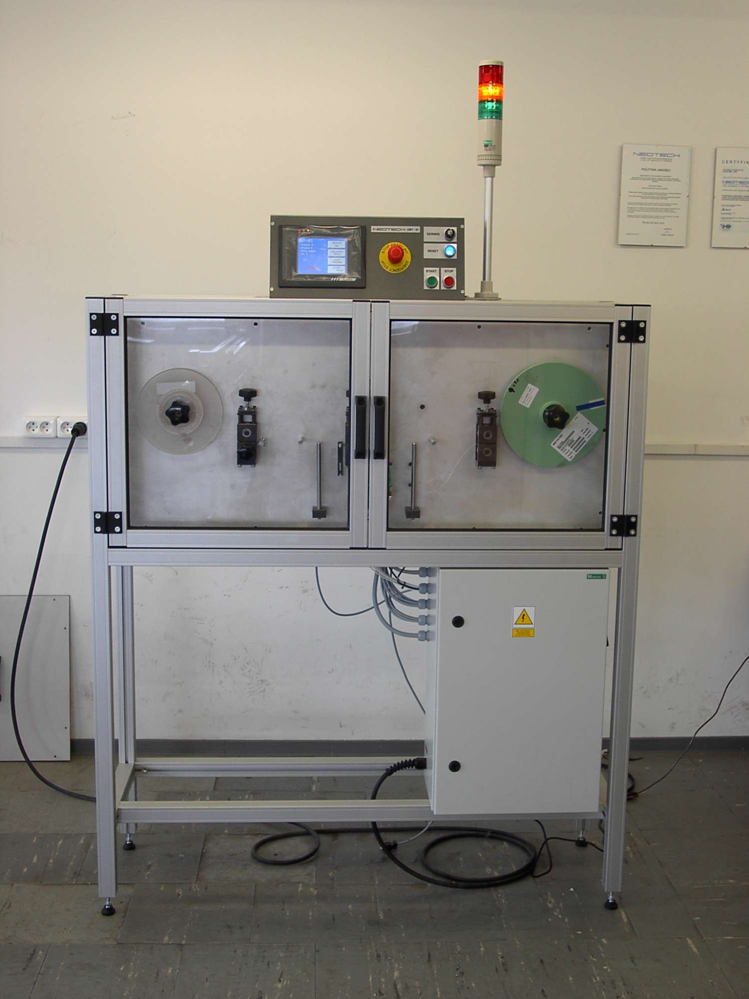 Maszyna UWT-01 działa w cyklu automatycznym. Możliwa jest praca ciągła do skończenia taśmy w szpuli odwijającej lub praca z zadaną długością taśmy do wykonania.